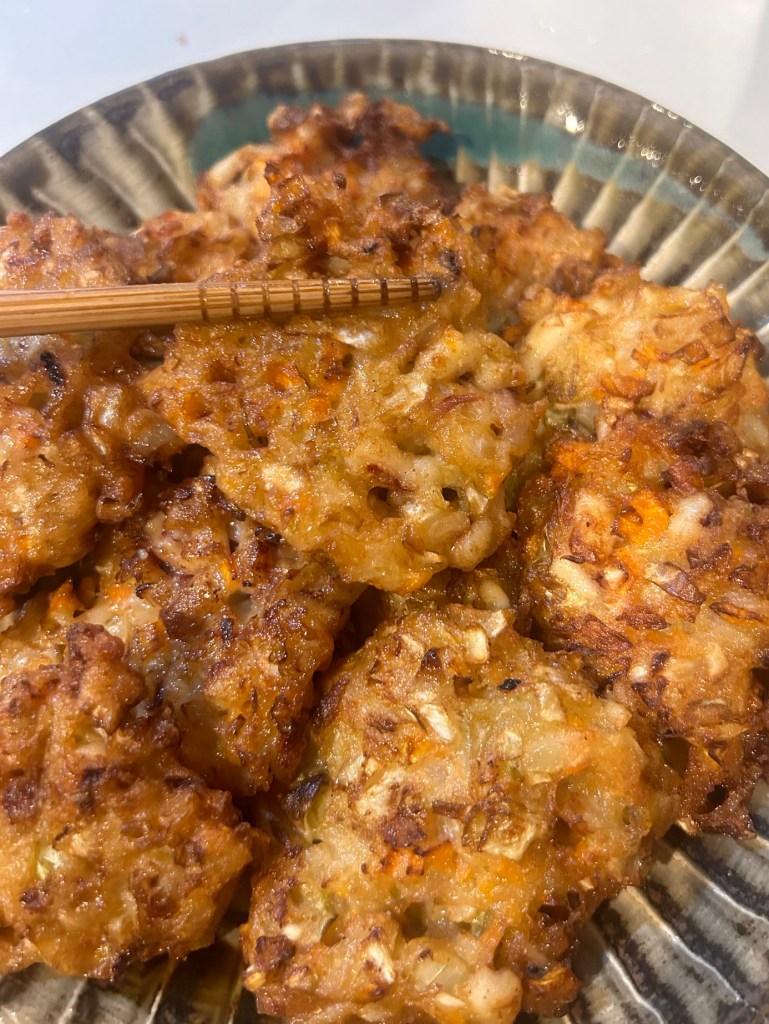 本来は下足を使うらしいんですが、贅沢に身をたっぷり使って人参・キャベツ・玉ねぎと一緒に刻んで小麦粉片栗粉と卵としっかり揉み込んで…揚げ焼きにしてみましたー!