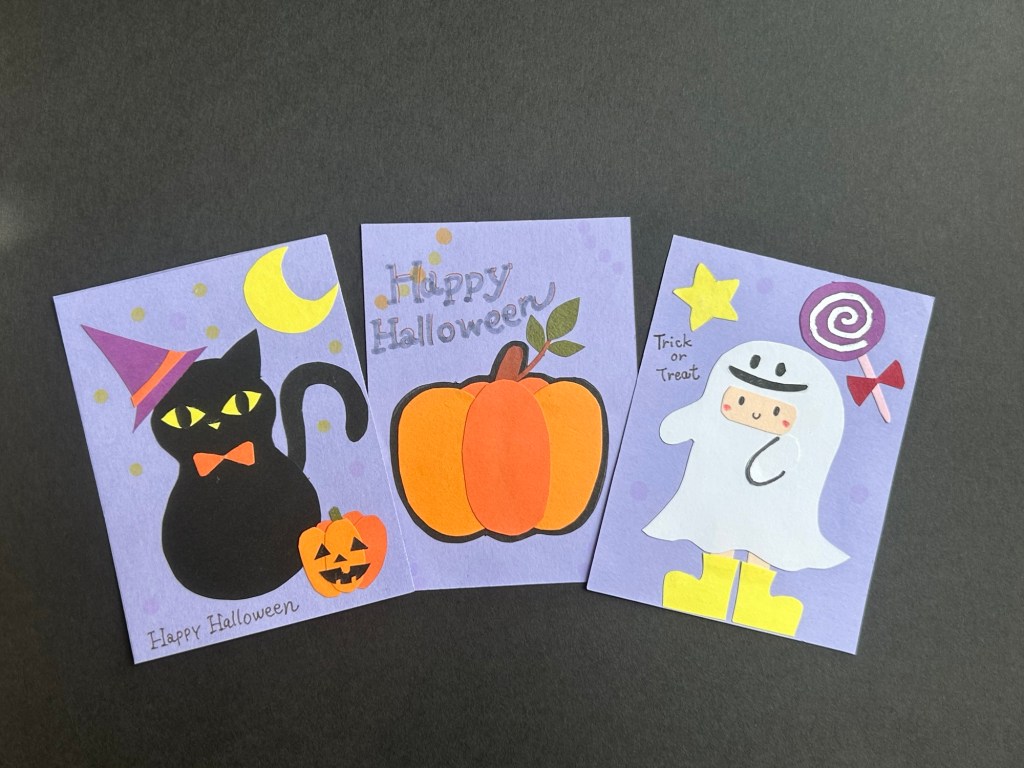 ハロウィンを彩る、手作りのメッセージカード3枚セットです。