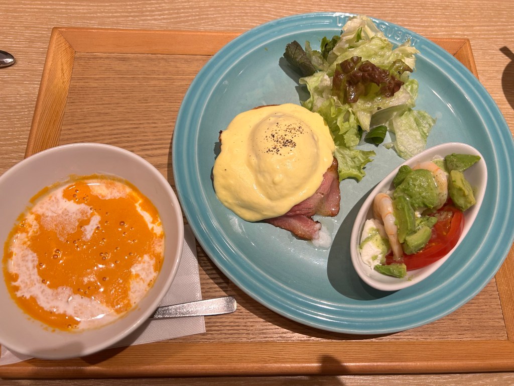 エッグベネディクトとアボカドのサラダ+スープ(写真)